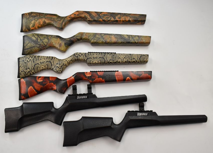 Six Nikko Stirling and Hawke stock blanks in various camouflage and similar finishes.