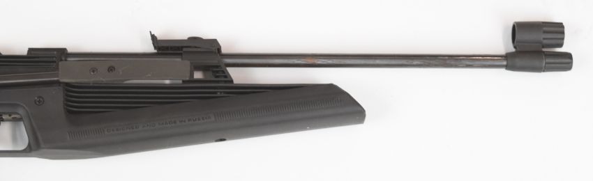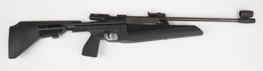 Baikal MP-60 .177 side-lever air rifle with composite tactical stock, pistol grip and adjustable sights and trigger, serial number 156007345.