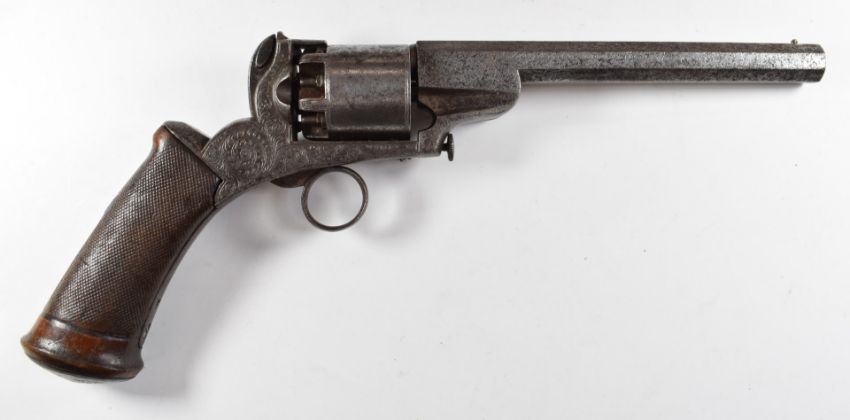 Belgian 54 bore six-shot self-cocking percussion revolver with ring trigger, engraved frame and butt cap, chequered grip and 7 inch octagonal barrel, overall length 35.5cm.