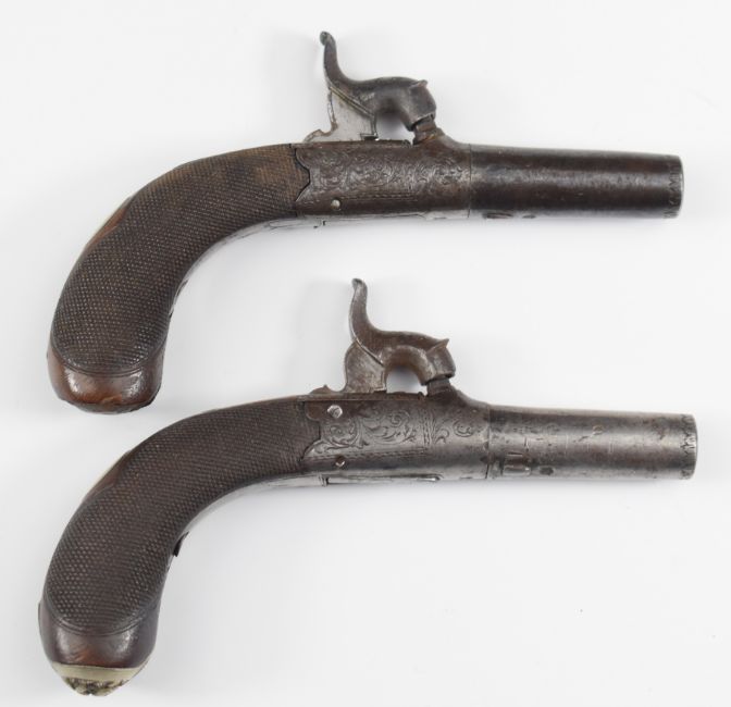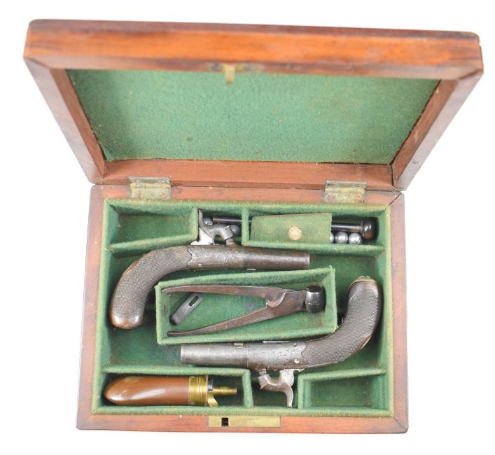 A pair of Williams & Powell of Liverpool percussion hammer action muff pistols, each with named top strap, engraved action, folding trigger, chequered grip, wrist cartouche and 1.5 inch turn-off barrel, overall length 13cm, in fitted mahogany case with powder flask, bullet mould and accessories.