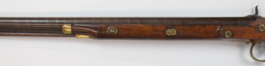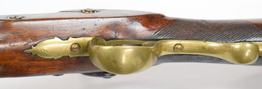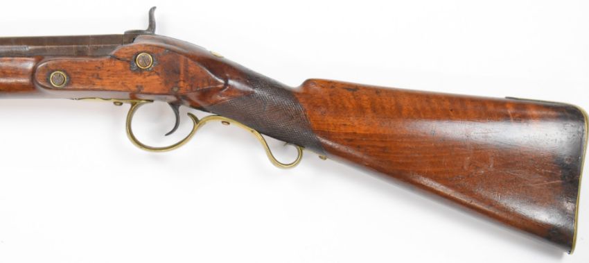 Unnamed 8 bore percussion converted from flintlock hammer action muzzle loading gun with engraved lock and hammer, chequered grip, brass scrolling trigger guard, butt plate and mounts, brass tipped wooden ram-rod and 41.5 inch barrel, overall length 144cm, NVSN.