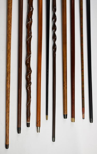 Ten walking sticks / canes including unusual twisted stick with white metal wirework decoration, specimen wood example, inlaid, carved, Japanned and Indian white metal knopped malacca sticks