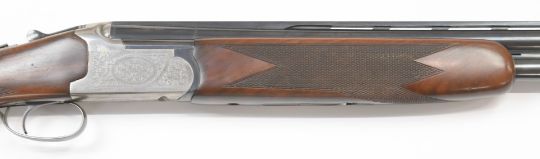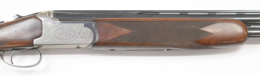 Lanber 12 bore over and under ejector shotgun with engraved locks, trigger guard, underside and thumb lever, chequered semi-pistol grip and forend, vented top and central ribs, single trigger and 27.5 inch multi-choke barrels, overall length 113cm, length of pull 36cm, serial number 278979. PLEASE NOTE THAT A VALID RELEVANT FIREARMS/SHOTGUN CERTIFICATE IS REQUIRED TO HANDLE/PURCHASE THIS ITEM.