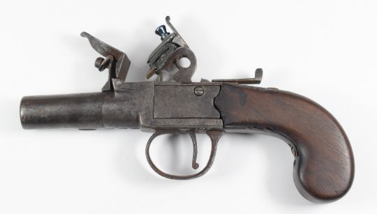 English flintlock pocket pistol with thumb slide safety, shaped wooden grip and 2 inch turn-off barrel, overall length 17.5cm.