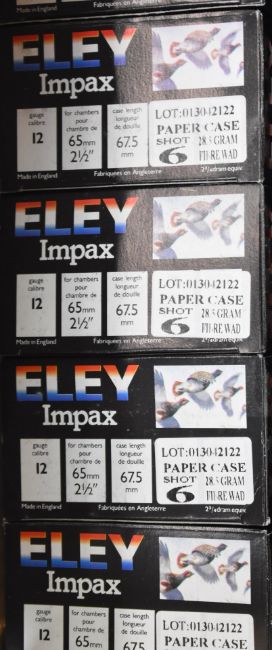 Three-hundred-and-fifty 12 bore Eley Impax shotgun cartridges, in original boxes. PLEASE NOTE THAT A VALID RELEVANT FIREARMS/SHOTGUN CERTIFICATE IS REQUIRED TO HANDLE/PURCHASE THIS ITEM.We are not able to post this lot.