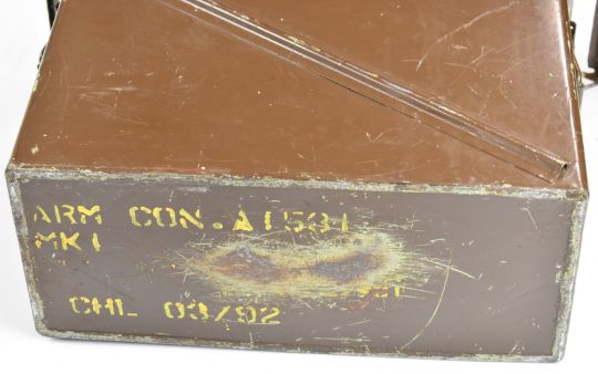 Two metal military style ammunition tins, one for 7.62 rounds, largest 47 x 22 x 37cm
