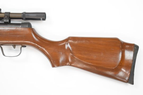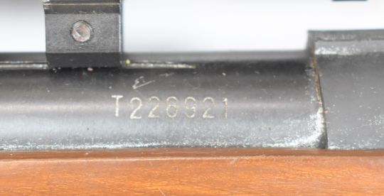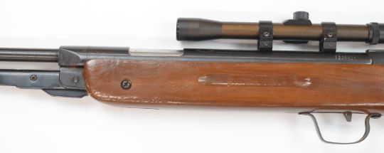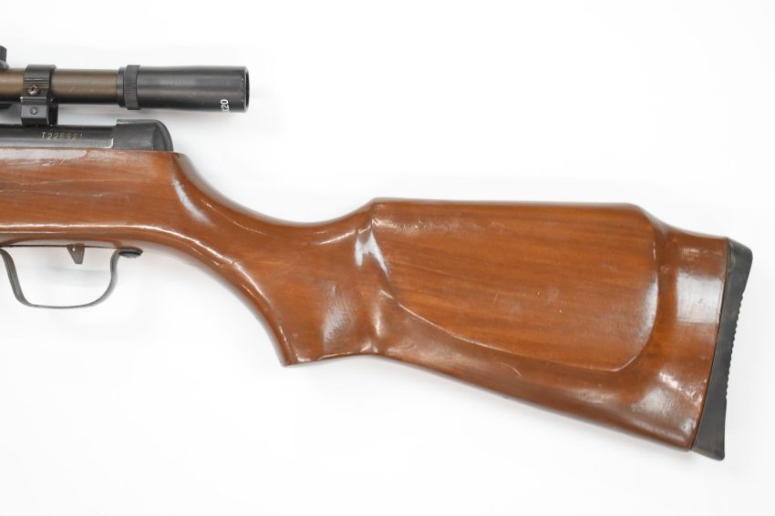 Snow Peak .22 under-lever air rifle with semi-pistol grip, sling mounts and 4x20 scope, serial number T226921.