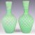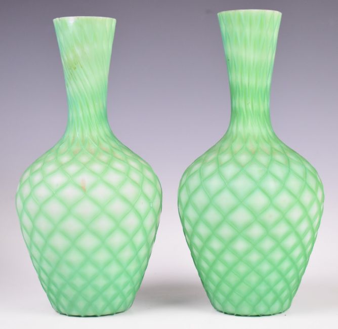 Three Stourbridge glass vases comprising a pair of quilted air trap satin bottles vases (21.5cm tall) and a Richardsons vase with green and white spiralling decoration.