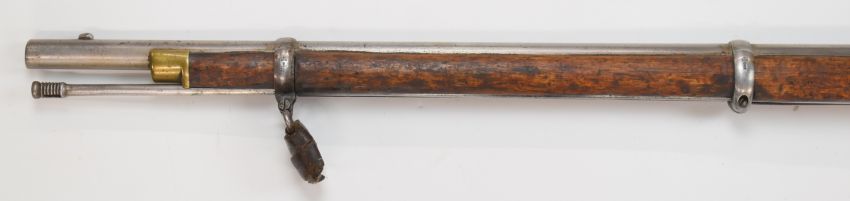 Enfield percussion hammer action 3-band musket with lock stamped '1858 Enfield' and with crown over 'VR' cypher, military stamp to the stock, brass trigger guard, butt plate and mounts, steel ram-rod, belt loops, adjustable pop-up ladder sights and 39 inch smooth bored barrel, overall length 139.5cm.