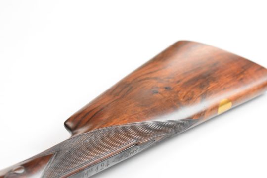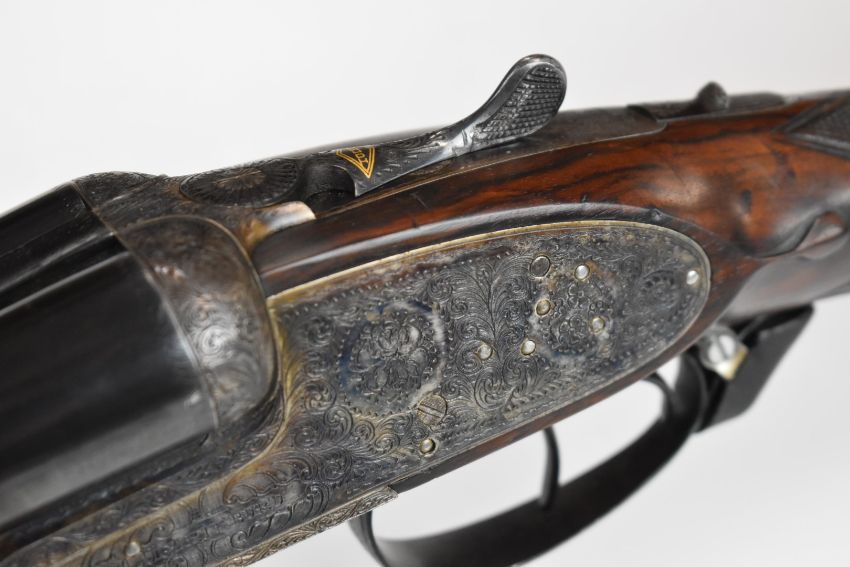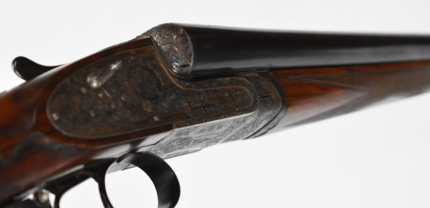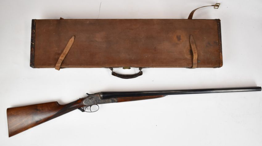 Ugarteburu 12 bore sidelock side by side ejector shotgun with named and engraved locks, engraved top plate, gold inlaid thumb lever, underside, fences and trigger guard, chequered grip and forend, vacant cartouche to the underside of the stock, double trigger and 25.25 inch barrels choked ¼ and ½, overall length 112cm, length of pull 36.5cm, serial number 40460, in fitted canvas and leather bound case. PLEASE NOTE THAT A VALID RELEVANT FIREARMS/SHOTGUN CERTIFICATE IS REQUIRED TO HANDLE/PURCHASE THIS ITEM.