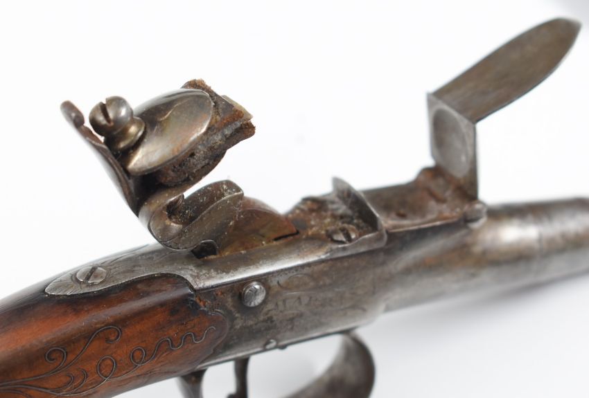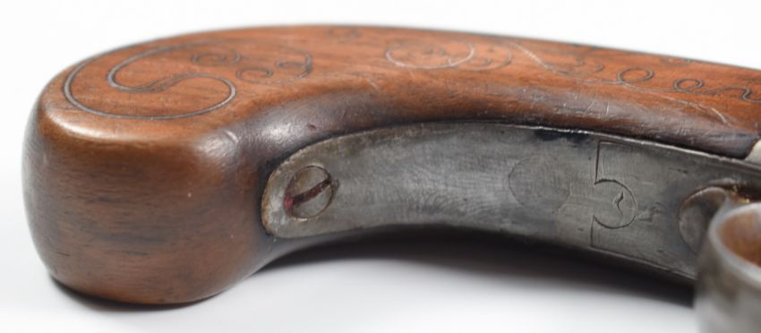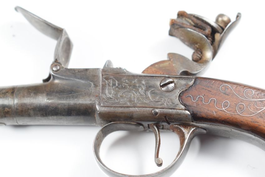 A pair of E Harris of Leicester Queen Anne flintlock pocket pistols, each with named and engraved lock, silver wire inlaid stock and 2 inch turn-off cannon barrel, overall length 17cm.