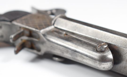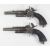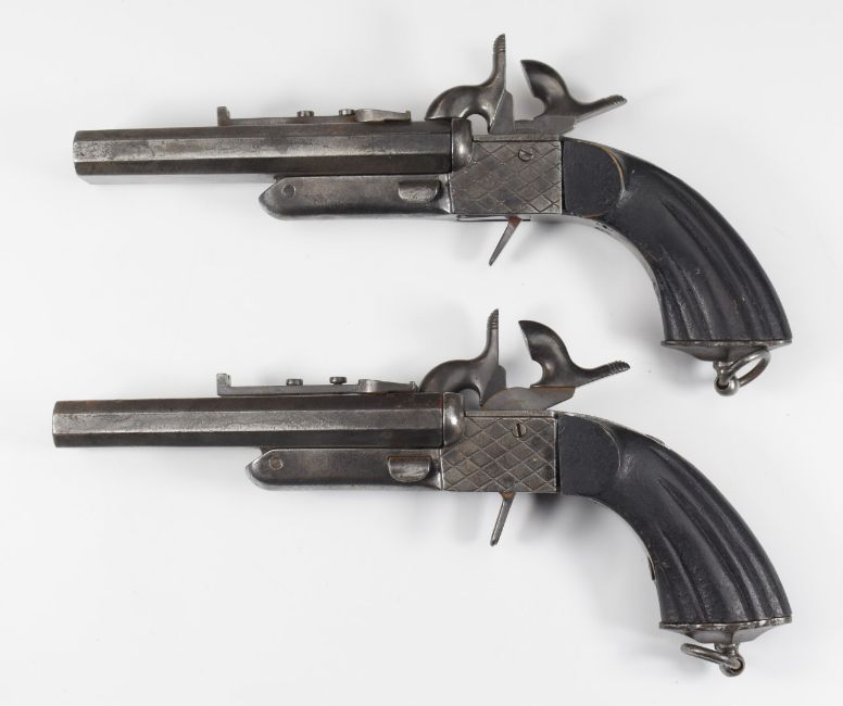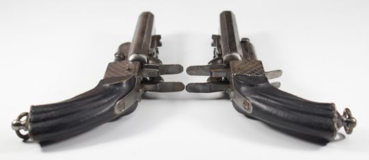 A pair of Spanish double barrelled side by side pinfire hammer action pistols each with chequered lock, reeded grip, belt loop, folding triggers, sliding safety and 4.75 inch octagonal barrels, overall length 23cm.