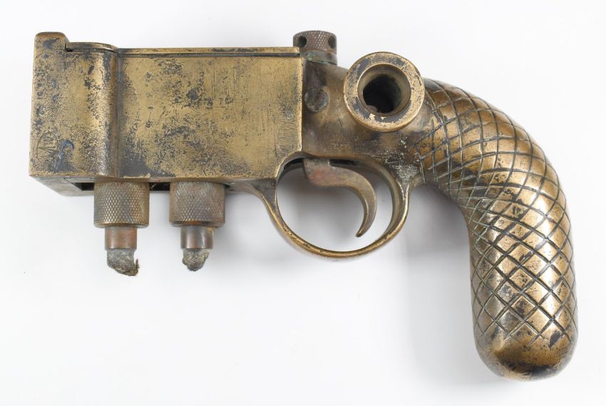 Bronze pistol for the electrical firing of Naval ship main guns, with chequered grip, stamped AW either side of a broad arrow mark, 25cm long.
