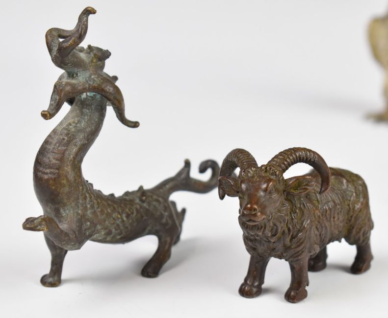 Collection of Japanese and Chinese bronze and cast metal animals including dragon, goat etc