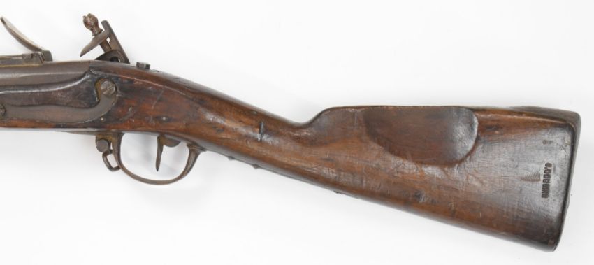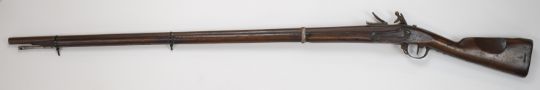 French or similar continental 10 bore flintlock three band musket with indistinctly named lock, stock stamped 'S Cousins', shaped cheek-piece, steel ram-rod, adjustable pop-up ladder sights and 44 inch smooth bored barrel, overall length 152cm.