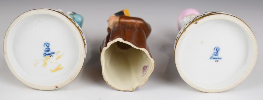 Two Dresden figures and a Royal Worcester monk candle snuffer, tallest 13.5cm
