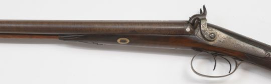 Holland & Burford muzzle loading double barrelled side by side percussion hammer action sporting gun with named and engraved locks, engraved stylised dolphin hammers, trigger guard, top strap, butt plate and mounts, chequered grip, vacant wrist cartouche, wooden ram-rod and gold inlaid 30 inch Damascus barrels, overall length 117.5cm.