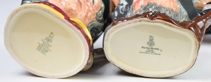 Twelve Royal Doulton large character jugs including Henry VIII, Drake, Pied Piper, and Robin Hood, tallest 18cm