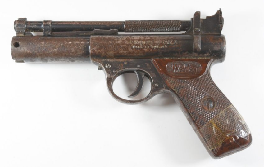 Webley Premier .22 air pistol with named and chequered Bakelite grips and adjustable sights, serial number 993.