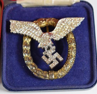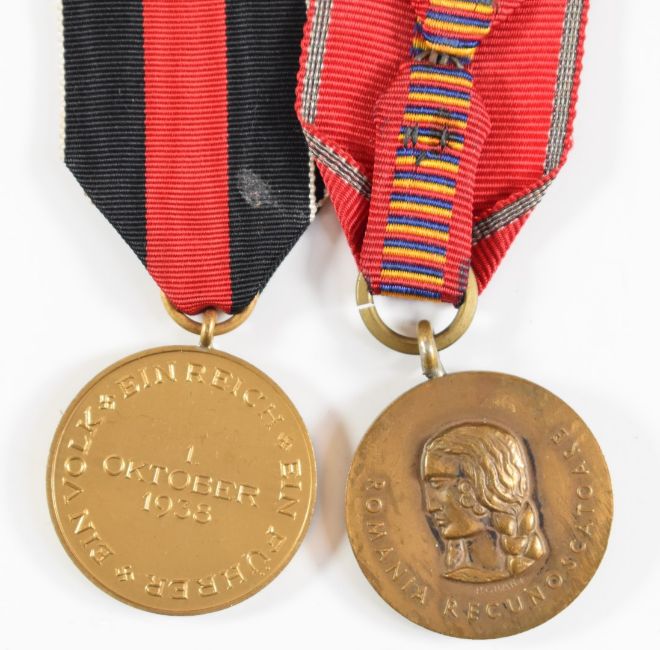 Replica / copy WW2 German badges including pilot's badge, Iron Cross, Deaths Head badge and Sudetanland medal together with a wound badge and Romanian 1941 medal