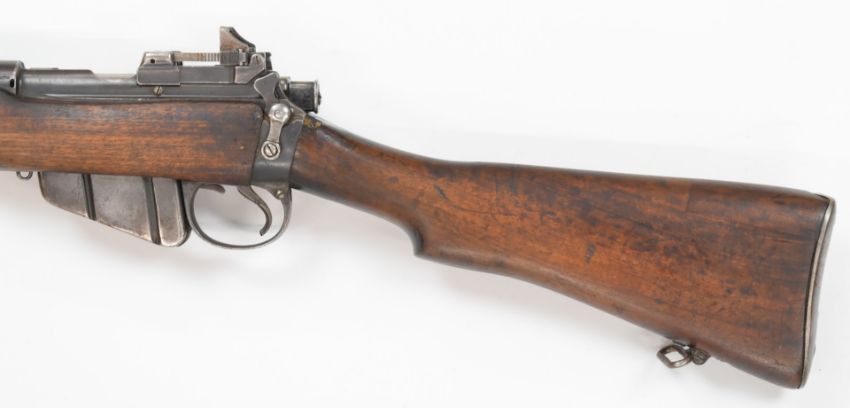 Short Magazine Lee-Enfield (SMLE) Mk V .303 bolt-action rifle with adjustable wide rear aperture sights, storage compartment to the butt plate, frame stamped with crown over 'GR' cypher and 'Enfield 1924 ShtLE V', sling mounts and 25 inch barrel, overall length 110.5cm, serial number 3745. The Mark V rifle proved too expensive to manufacture and as such was never issued to troops for British service. PLEASE NOTE THAT A VALID RELEVANT FIREARMS/SHOTGUN CERTIFICATE IS REQUIRED TO HANDLE/PURCHASE THIS ITEM.