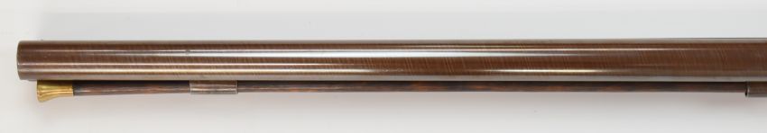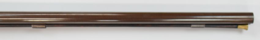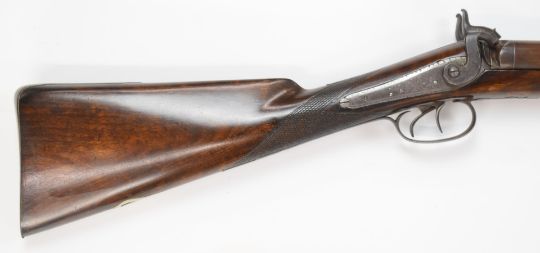 English 10 bore side by side double barrelled muzzle loading percussion hammer action shotgun with engraved locks, hammers, top strap, trigger guard, butt plate and mounts, storage compartment to the underside of the stock, brass tipped wooden ram-rod and 33.75 inch Damascus barrels engraved 'London', NVSN.