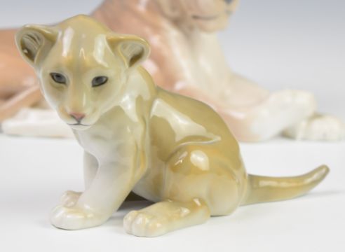 Copenhagen figure of a recumbent lioness and two cubs, tallest 16cm