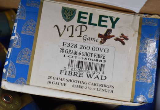 Over six-hundred 16 bore shotgun cartridges including Eley Grand Prix and Eley VIP Game, some in original boxes. PLEASE NOTE THAT A VALID RELEVANT FIREARMS/SHOTGUN CERTIFICATE IS REQUIRED TO HANDLE/PURCHASE THIS ITEM.We are not able to post this lot.