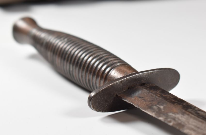 Fairbairn Sykes style fighting knife with 17cm double edged blade and leather sheath. PLEASE NOTE ALL BLADED ITEMS ARE SUBJECT TO OVER 18 CHECK ON COLLECTION OR DELIVERY