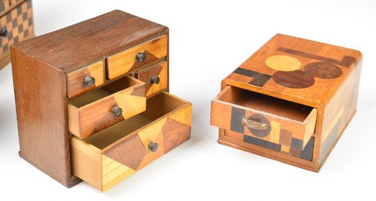 A collection of Japanese marquetry / parquetry boxes including a puzzle money box and a solitaire game box, tallest 12.5cm
