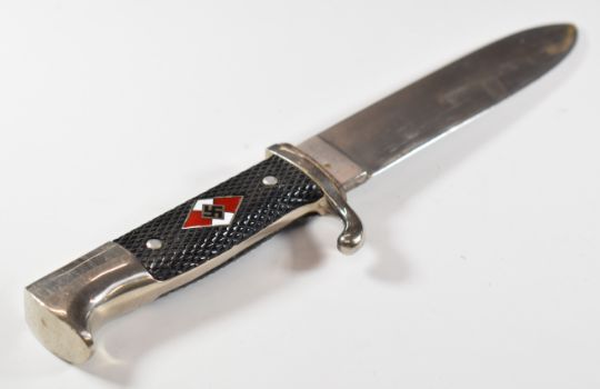 Replica Hitler Youth dagger with 14cm blade stamped DSE and Rostfrfi, with scabbard. PLEASE NOTE ALL BLADED ITEMS ARE SUBJECT TO OVER 18 CHECK ON COLLECTION OR DELIVERY