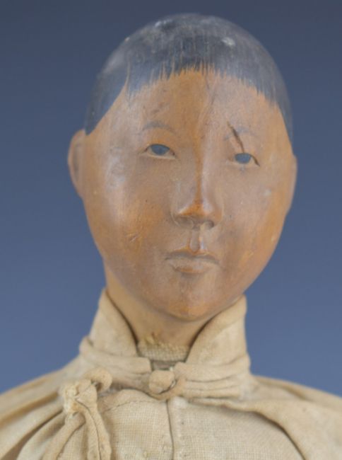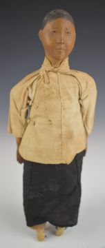 Chinese 'Door of Hope' doll wearing a black dress and cream jacket, with carved bun hairstyle, height 28cm