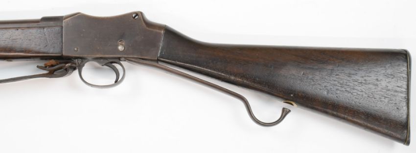 Enfield Martini Henry Mk IV 1886 .577/ 450 service rifle with lock stamped with crown over 'V.R.' cypher and 'Enfield 1886 IV 1', pop-up ladder sights, leather sling, stock stamped with eastern script and 10059 4G BI 700 Al 10 1900' amongst other stamps, steel ram-rod, bayonet mount and 33 inch barrel, overall length 125cm.
