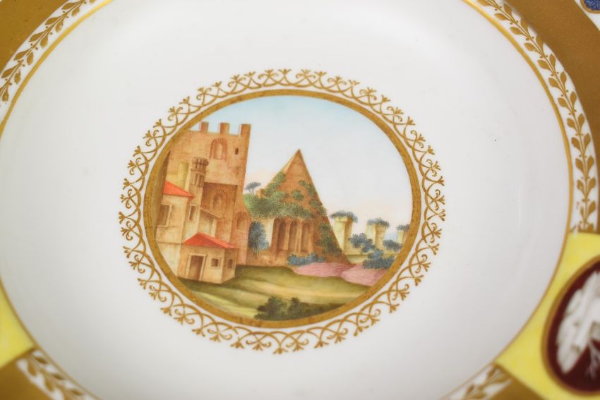 Russian 19thC porcelain pedestal dish with hand painted decoration of Port de St Paul and partial label verso 'Presented by the Emperor Alexander I to Queen Charlotte of Wurtemburg', diameter 24cm