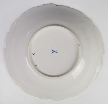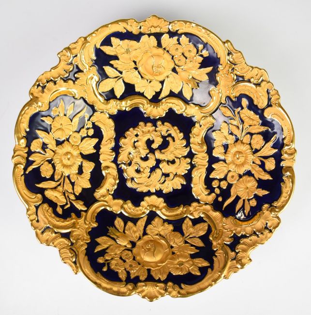 Meissen large shaped pedestal dish with relief moulded decoration of gilded flowers against a navy ground, diameter 31cm