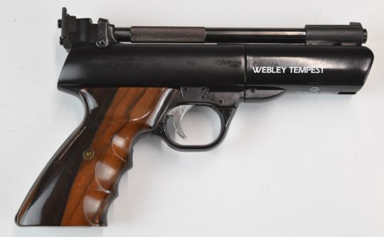 Webley Tempest .22 target air pistol with shaped wooden grips and adjustable sights, NVSN, in fitted box with paper targets.
