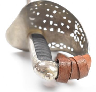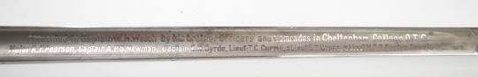 British 1897 pattern officer's presentation sword AG Parker & Co Ltd, Birmingham retailer, inscription on 84cm blade 'Presented to Captain W N Weech by his brother officers and comrades in Cheltenham College OTC, Major R F Pearson, Captain A P S Newman, Captain E H Byrde, Lieut T C Currie, 2 Lieut S T Cross, 2 Lieut M D R Seaton, Private C L Ford', with sword knott and scabbard. PLEASE NOTE ALL BLADED ITEMS ARE SUBJECT TO OVER 18 CHECK ON COLLECTION OR DELIVERY