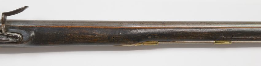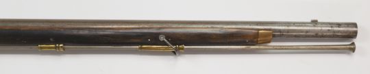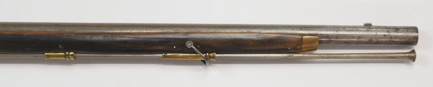 French or similar continental flintlock musket with brass trigger guard, butt plate, mounts and wrist cartouche, steel ram-rod and 39 inch smooth bored barrel, overall length 138cm.