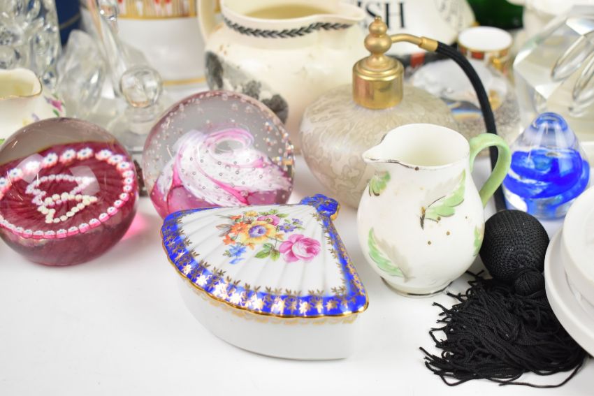 A collection of ceramics and glass to include Royal Crown Derby Imari miniature tyg, McNish whisky jug, Wedgwood biscuit barrel, creamware jug, Shelley jug, Copenhagen plaques, Caithness paperweights, perfume bottles etc