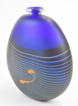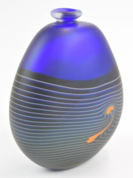 Robert Wynne Denizen glass vase with orange and yellow decoration on blue ground, impressed fire breathing dragon mark to the base, 17cm tall.