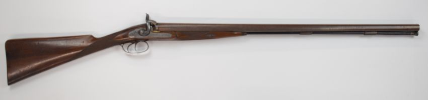 Richard Burnand of Newcastle on Tyne double barrelled side by side percussion hammer action sporting gun with engraved scenes of dogs to the named locks, engraved stylised dolphin hammers, trigger guard, top strap and butt cap, chequered grip and forend, vacant wrist cartouche, brass tipped wooden ram-rod and named 29.5 inch Damascus barrels, overall length 117cm, in fitted brass and leather bound gun case with show and powder flasks and percussion cap tin.
