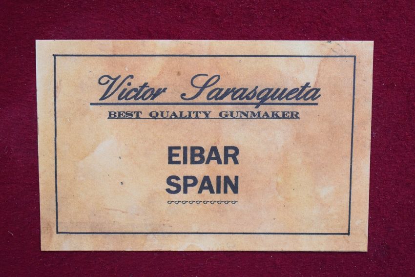 Leather and canvas bound double shotgun carry case with 'Victor Sarasqueta Best Quality Gunmaker Eibar Spain' label, 83 x 32 x 8cm.