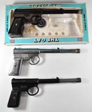 Three Umarex T J Harrington .177 'The Gat' air pistols, two with black painted and one with nickel plated finish, one in original box, all have NVSN.
