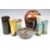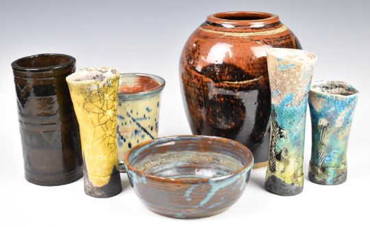 A collection of studio pottery including large vase with indistinct signature, bowl with MB monogram, three vases with impressed sunburst mark etc