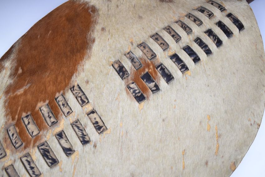 19th / 20thC leather / hide Zulu shield, spears, knobkerrie, axe and a bull's pizzle, longest 167cm