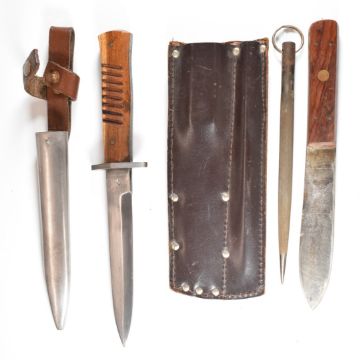 Replica German WW1 fighting knife with 15cm blade and scabbard, together with a throwing knife and sharpening steel, in leather carry case. PLEASE NOTE ALL BLADED ITEMS ARE SUBJECT TO OVER 18 CHECK ON COLLECTION OR DELIVERY