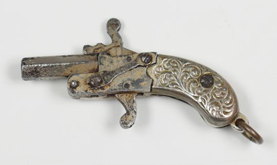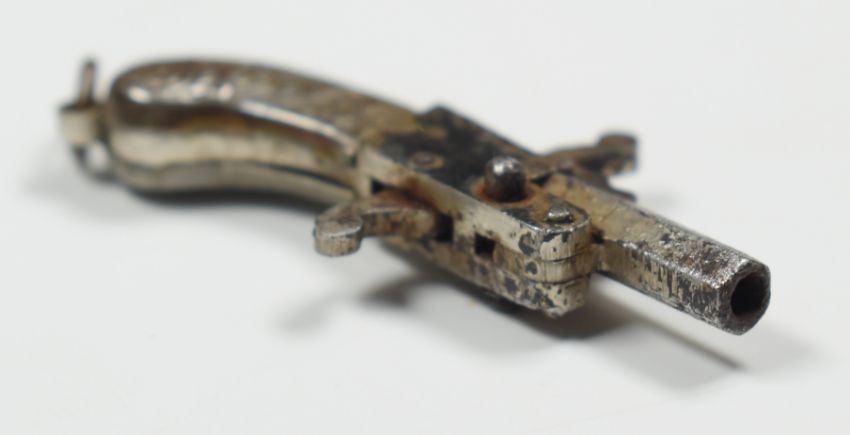 Austrian miniature pinfire hammer action pistol with engraved metal grip, ring loop and 0.5 inch octagonal barrel, overall length 4.2cm.