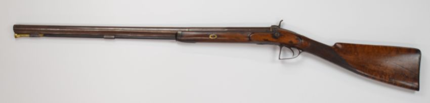 Perrins of Worcester single barrelled muzzle loading hammer action sporting gun with engraved bird scene to the named lock, engraved hammer and top plate, chequered grip, bird's eye walnut stock, shield shaped wrist cartouche, brass tipped wooden ram-rod and 28 inch gold inlaid, part-octagonal smooth bored Damascus barrel, overall length 112.5cm, NVSN.