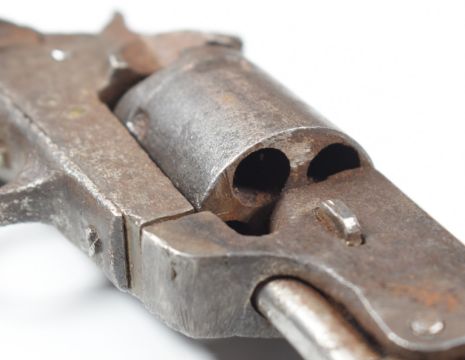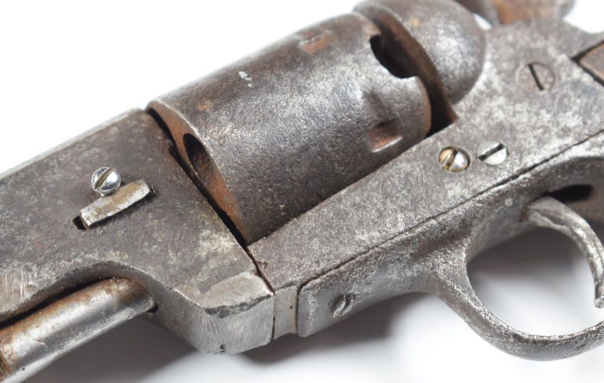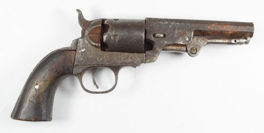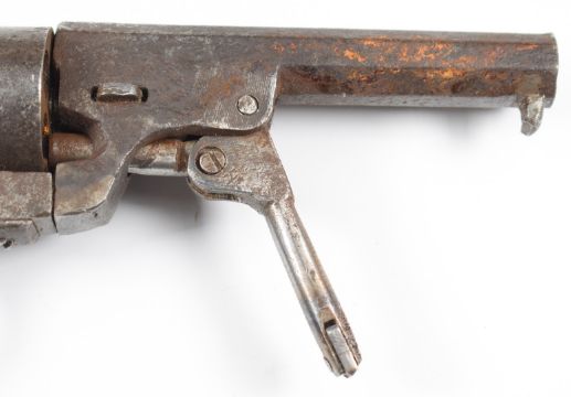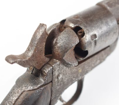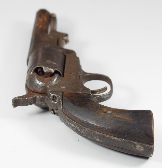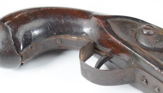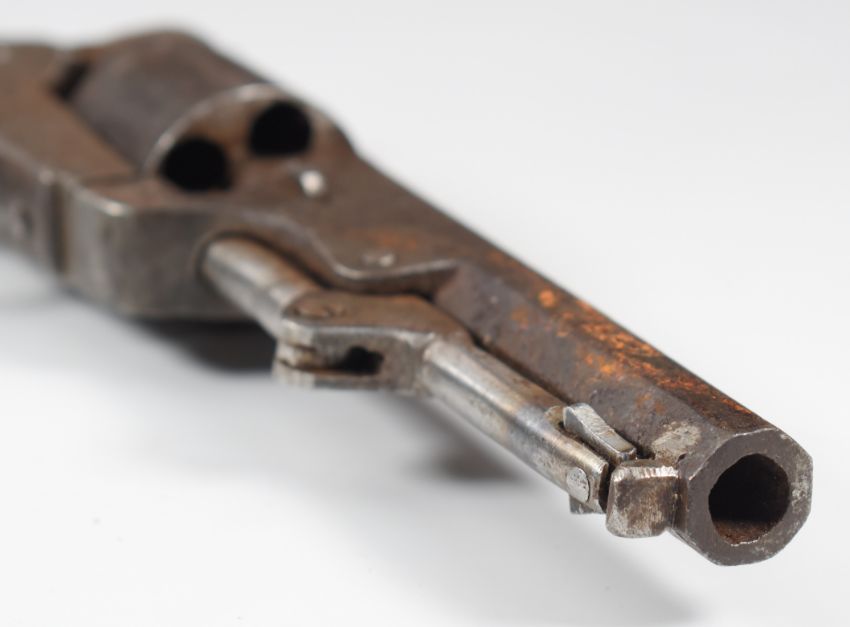 French or similar military style 14 bore percussion hammer action pistol with barrel sheath and 5 inch smooth bored barrel, overall length 26.5cm.