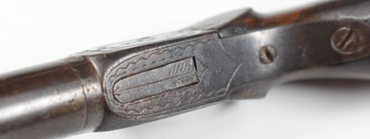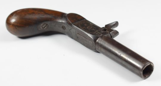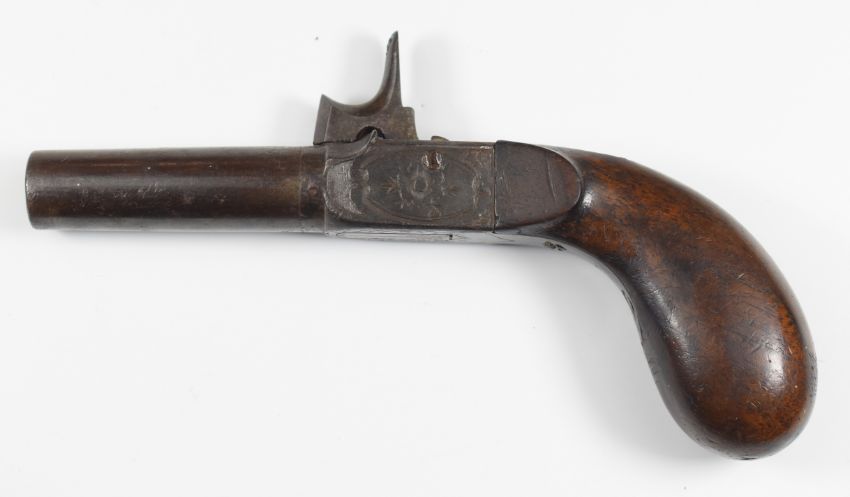 French percussion hammer action pocket pistol with engraved lock, top plate and underside, folding trigger, carved bag shaped wooden grip and 2.5 inch rifled barrel, overall length 16.5cm.